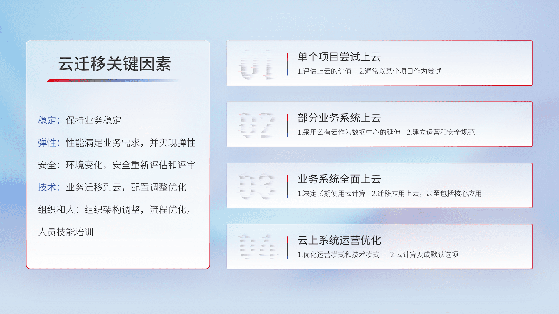 结合实际业务,,,,从规划设计、、、云平台选型、、、、云原生改造、、数据迁移、、、、集成交付,,,,迁移全过程为客户识别最佳上云路径,,,做好风险识别管理,,设计网络架构、、、身份权限、、、、安全审计合规、、、、操作审计、、、、日志审计、、监控告警策略、、多站点容灾设计等,,对云上基础设施进行整体规划,,提升IT治理水平,,,,以满足弹性、、、高可用、、、、高性能的需求。。