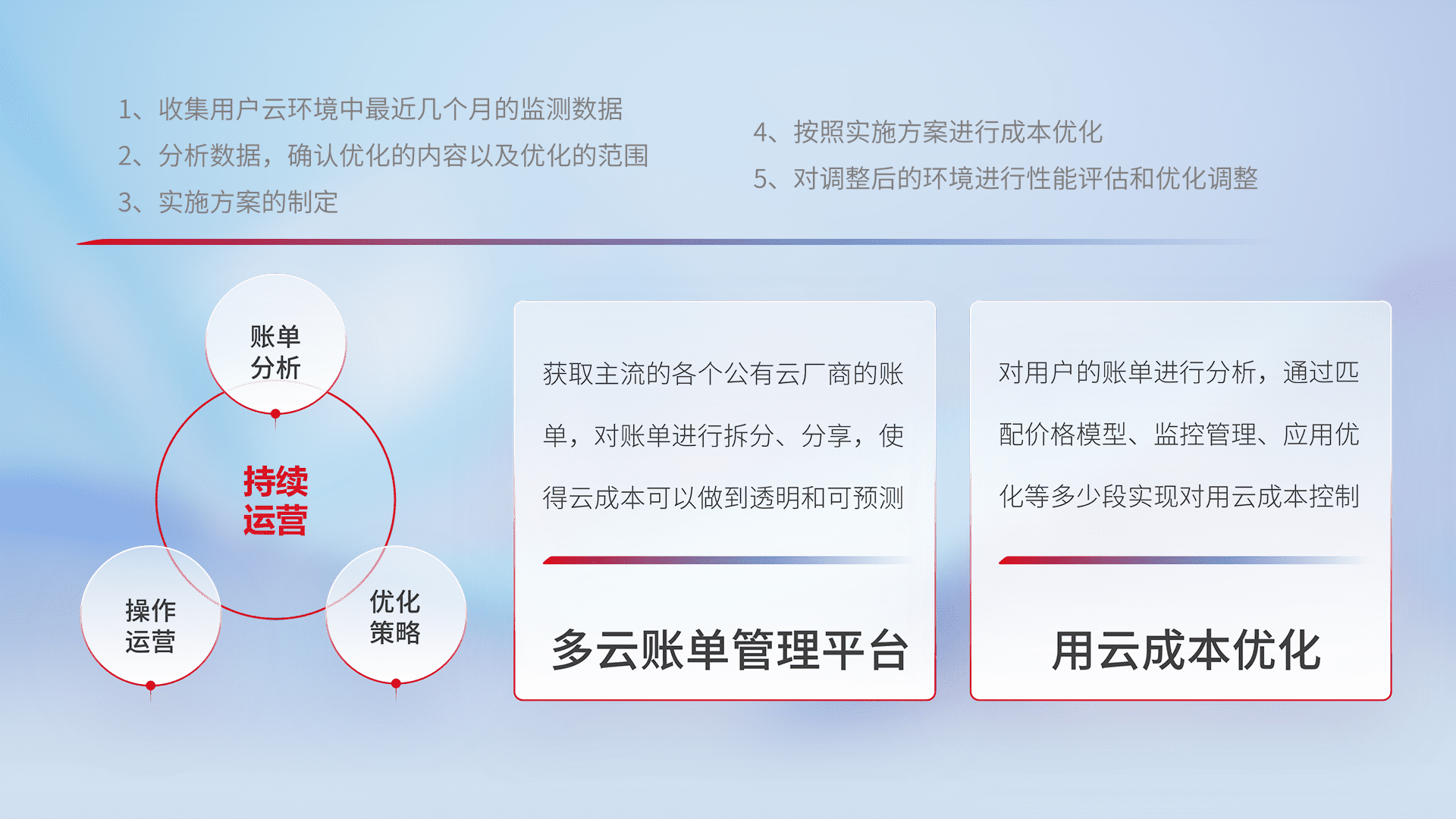 通过多云纳管,,以统一的资源数据模型把客户的云资源进行抽象和封装,,进而实现对多云资源的统一操作,,,保障云资源管理的可靠性、、、稳定性与可用性。。。。量身定制化运维内容,,配置、、、开发运维、、、、补丁管理、、、备份、、监控、、、认证和访问管理、、、审计和日常巡检等,,,保障在用云过程中的可靠度,,稳定度以及高可用率。。。。